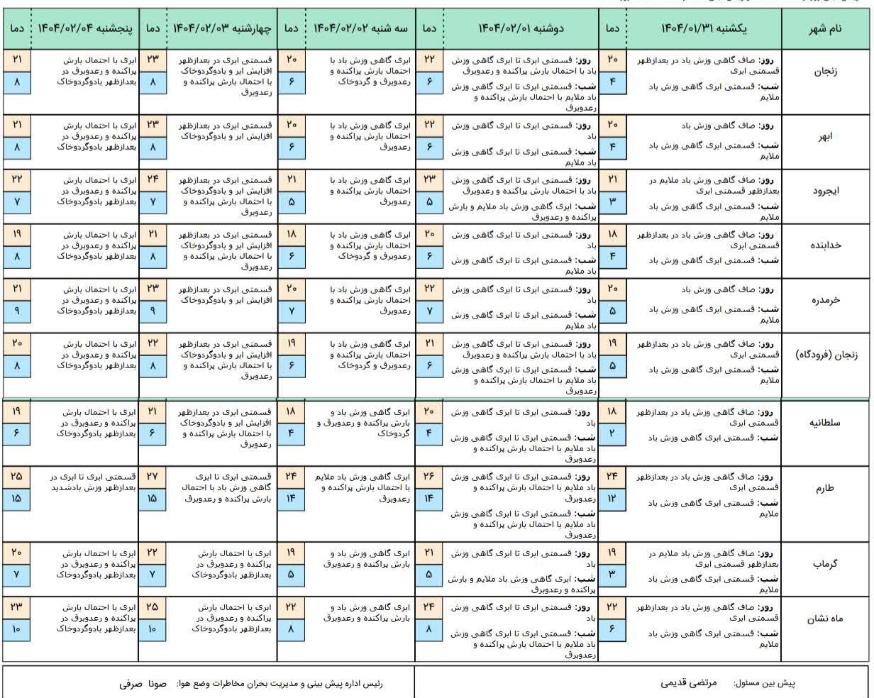 کارشناس پیش‌بینی اداره‌کل هواشناسی استان زنجان یاد آور شد: از لحاظ دمایی نیز روند تدریجی افزایش دما در سطح استان قابل مشاهده است. این افزایش دما در طول روزها محسوس‌تر خواهد بود و هوا به‌مرور به سمت گرمای بهاری پیش می‌رود. با عبور از نیمه دوم هفته، دمای بیشینه در اغلب مناطق استان افزایش یافته و هوا به‌ویژه در طول روز، حالت نسبتاً گرمی به خود می‌گیرد.