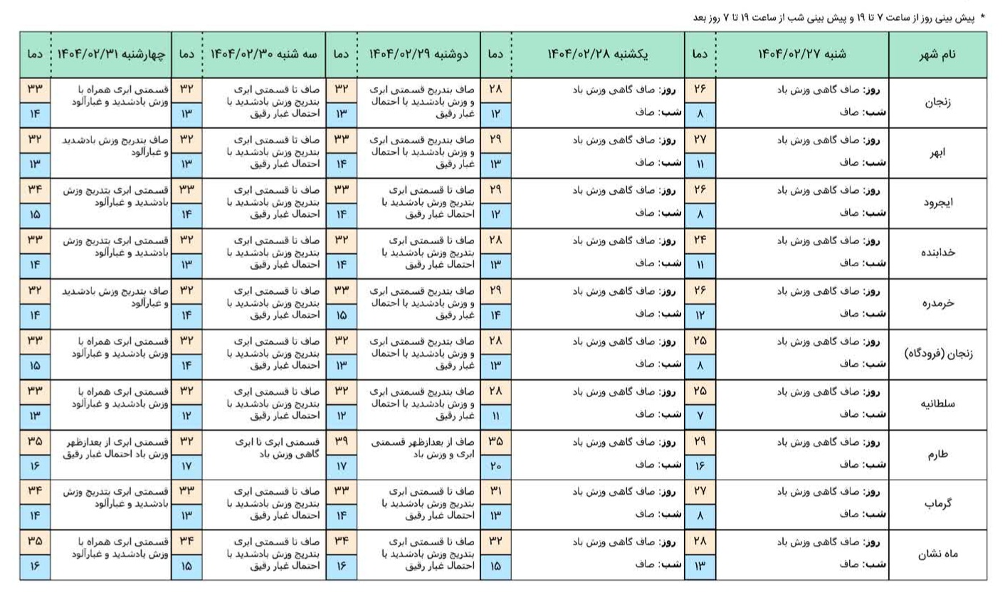 کارشناس پیشبینی هواشناسی استان زنجان در ادامه خاطرنشان کرد: این شرایط جوی میتواند منجر به خیزش گرد و غبار در برخی نواحی شود که بهویژه در روز چهارشنبه شدت بیشتری خواهد یافت.