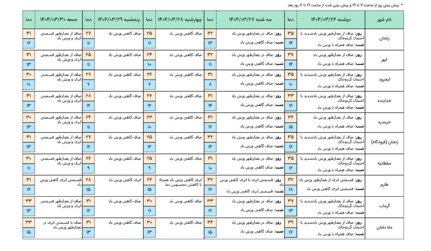 کارشناس هواشناسی زنجان با تأکید بر پایداری نسبی جو طی روزهای آینده گفت: از فردا تا پایان هفته جاری، شرایط جوی استان به طور کلی پایدار خواهد بود و بر اساس دادههای فعلی، احتمال وقوع بارش در سطح استان وجود ندارد.