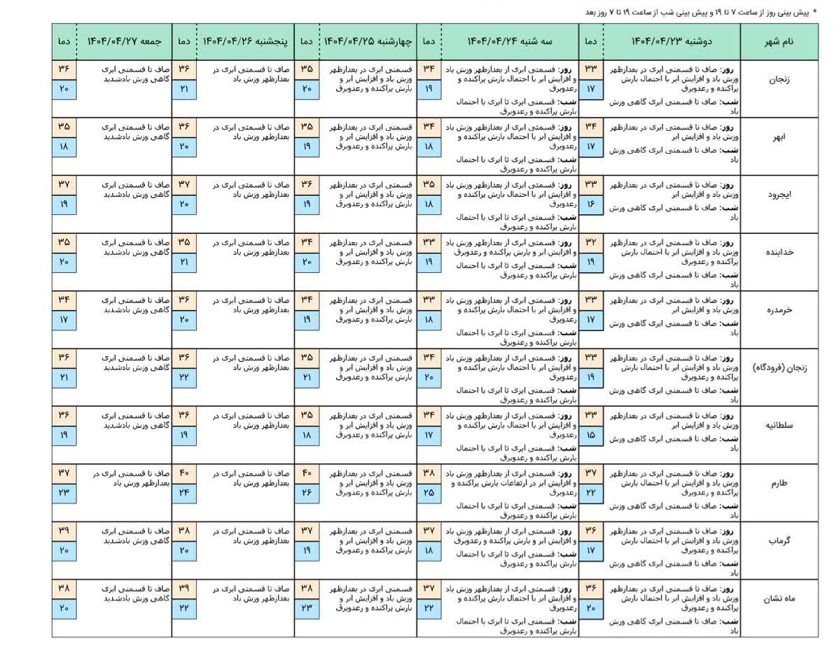 کارشناس پیش‌بینی هواشناسی استان زنجان گفت: از روز پنج‌شنبه به بعد، جو استان به‌تدریج پایدارتر خواهد شد و افزایش دمای هوا مشهود خواهد بود. در برخی مناطق گرمسیر زنجان نیز، دمای هوا ممکن است به ۴۰ درجه سانتی‌گراد نیز برسد.