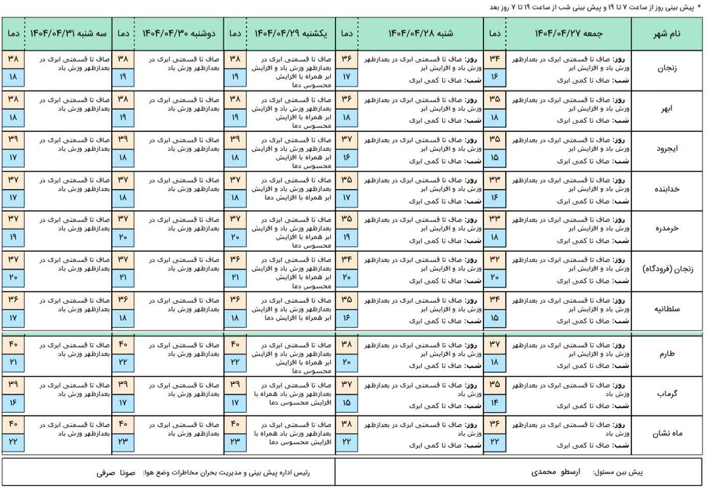 وی تصریح کرد: بر اساس بررسی نقشهها و دادههای هواشناسی، هوای استان زنجان در روزهای پیشرو عمدتاً صاف تا قسمتی ابری خواهد بود و در ساعات بعدازظهر، افزایش سرعت وزش باد و رشد ابر در برخی مناطق استان پیشبینی میشود.
