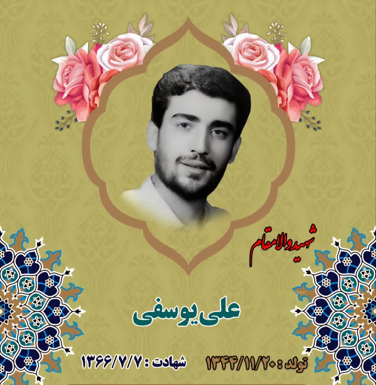 شهید علی یوسفی، کارمند ارتش بود. ازدواج کرد. هفتم مهر ۱۳۶۶، در بمباران هوایی کارخانه مهماتسازی پارچین تهران به شهادت رسید.